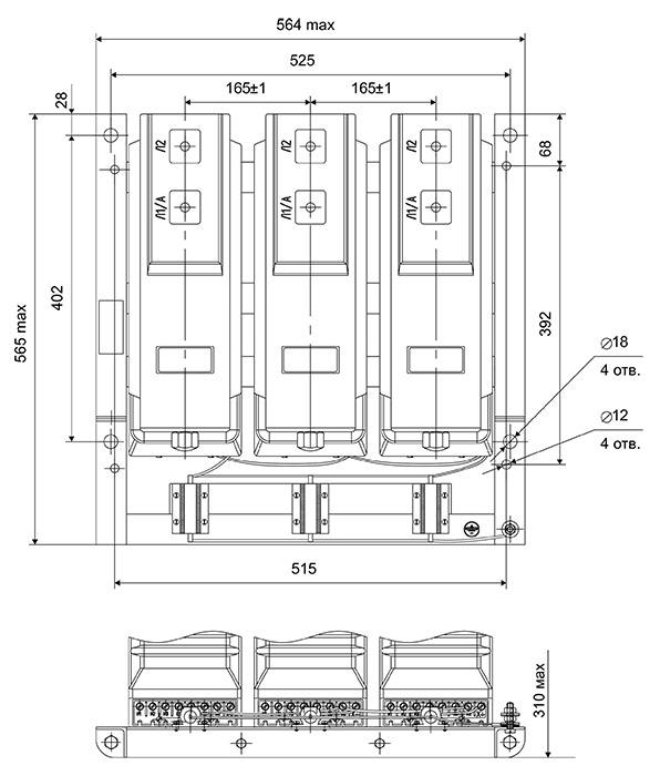 Трехфазная группа трансформаторов конструктивного исполнения -01 состоит из двух комбинированных трансформаторов ЗНТОЛП-НТЗ-6(10) и одного трансформатора тока ЗНОЛП-НТЗ-6(10)-01.