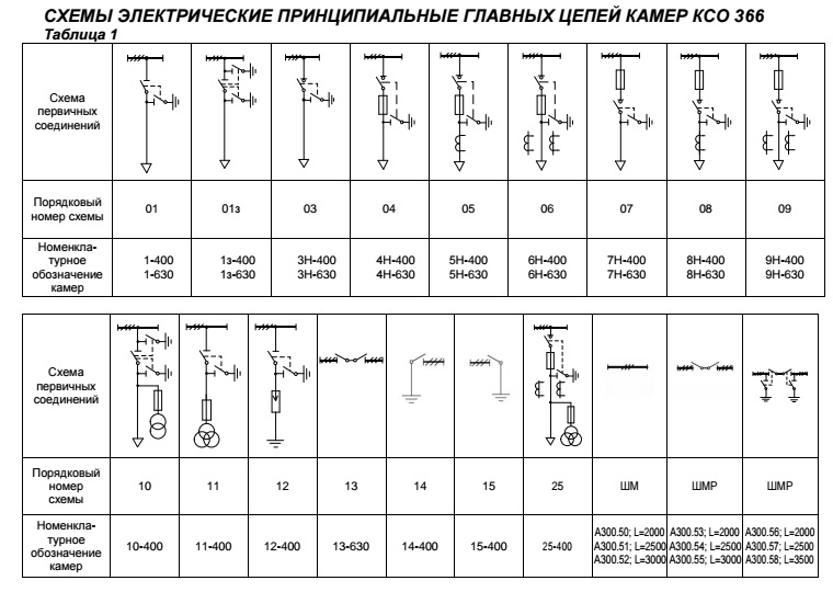 Принцип работы определяется совокупностью схем главных и вспомогательных цепей камер.Камеры КСО 366 выполняются по схемам главных цепей, приведенным в таблице 1. Они комплектуются выключателями нагрузки с ручным приводом, разъединителями и другими аппаратами высокого напряжения в зависимости от схемы, ошиновкой и шинными мостами.