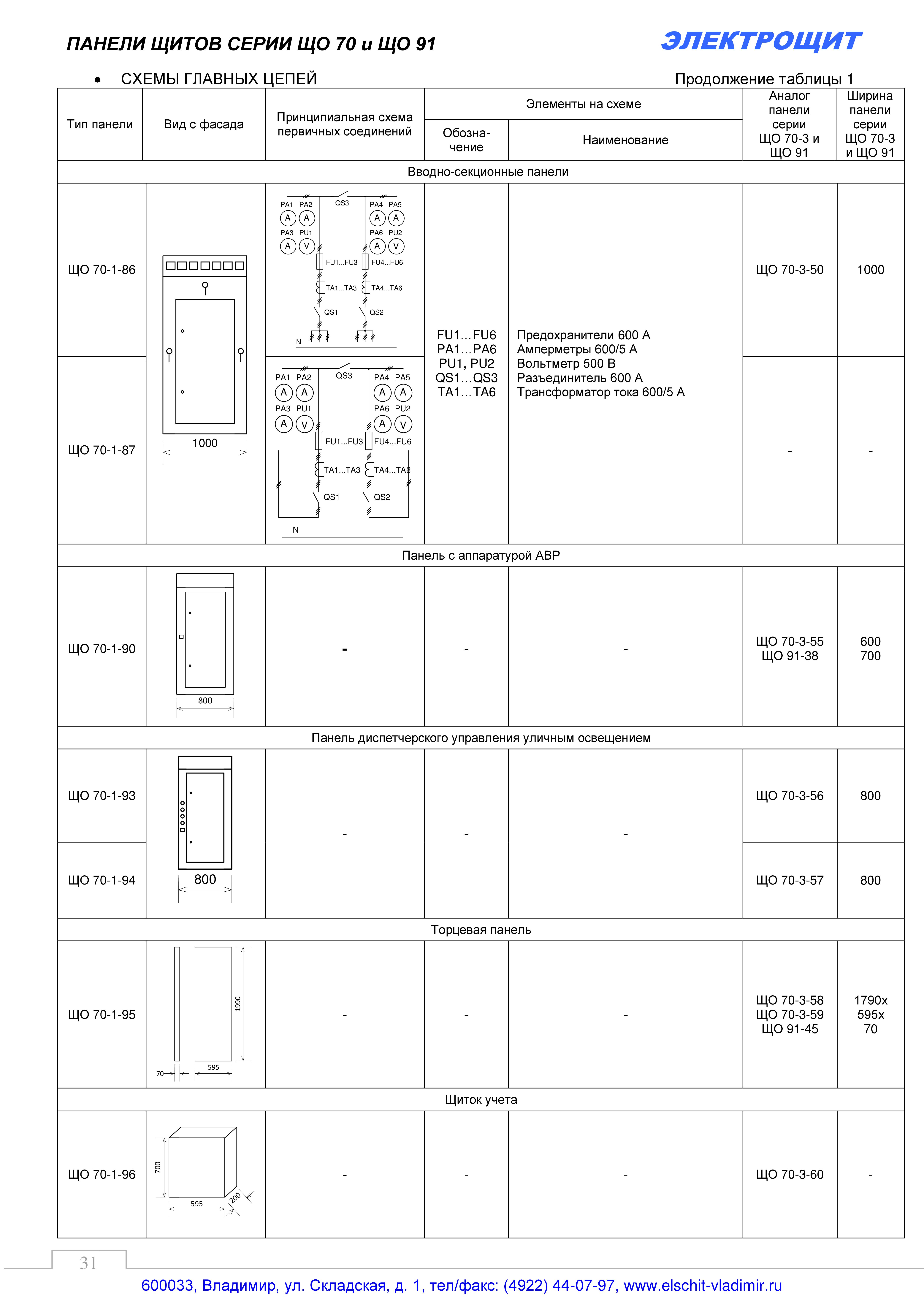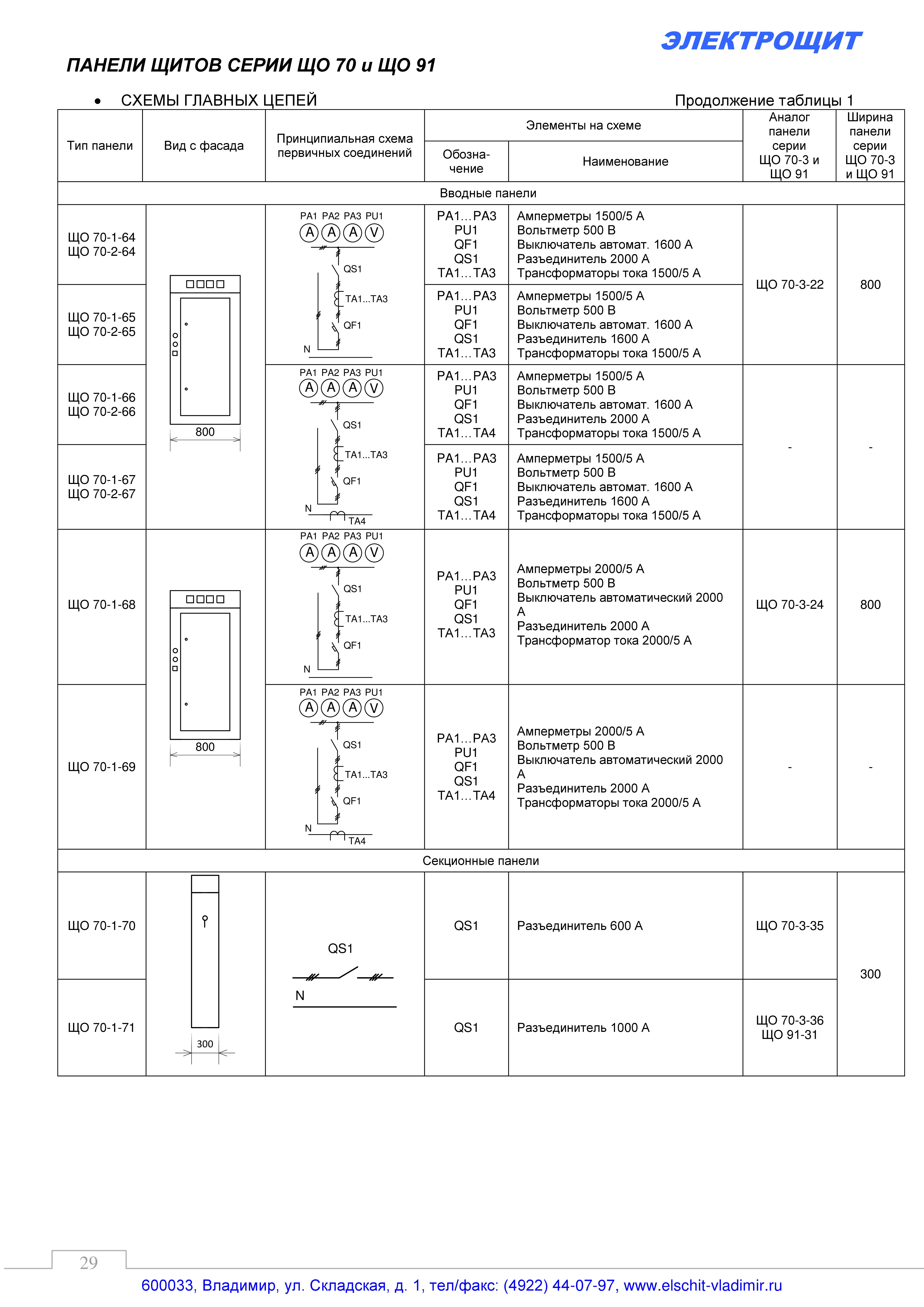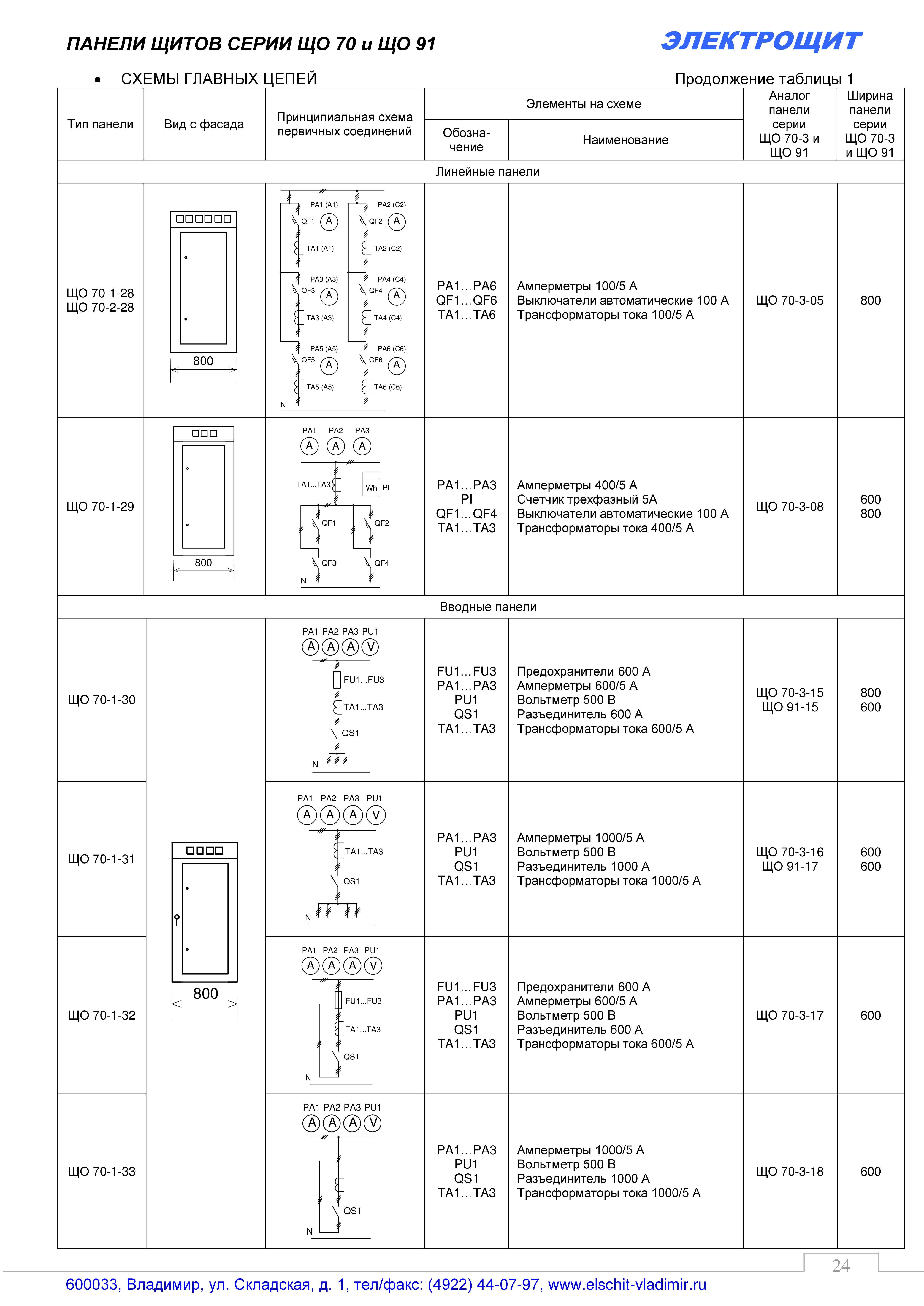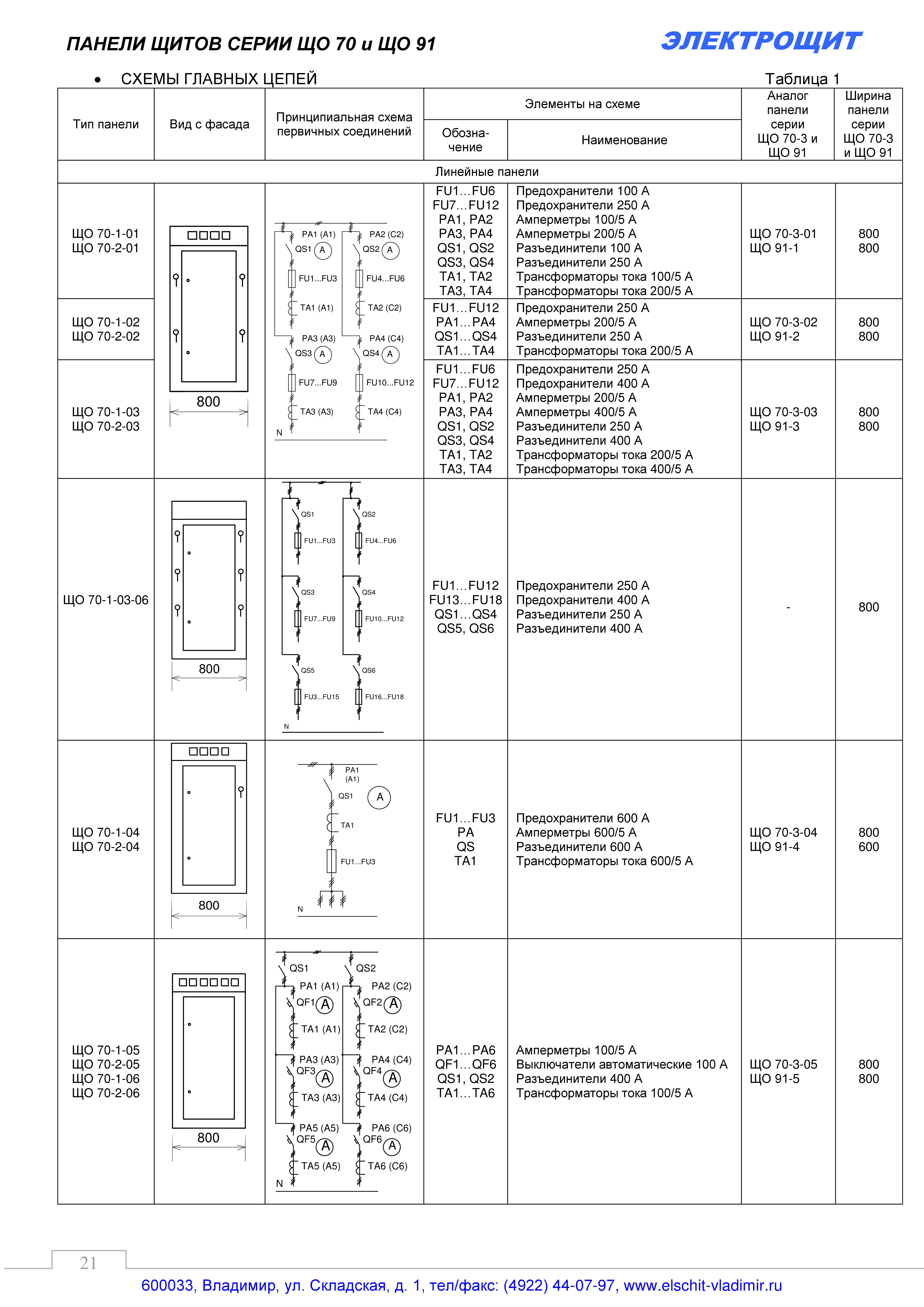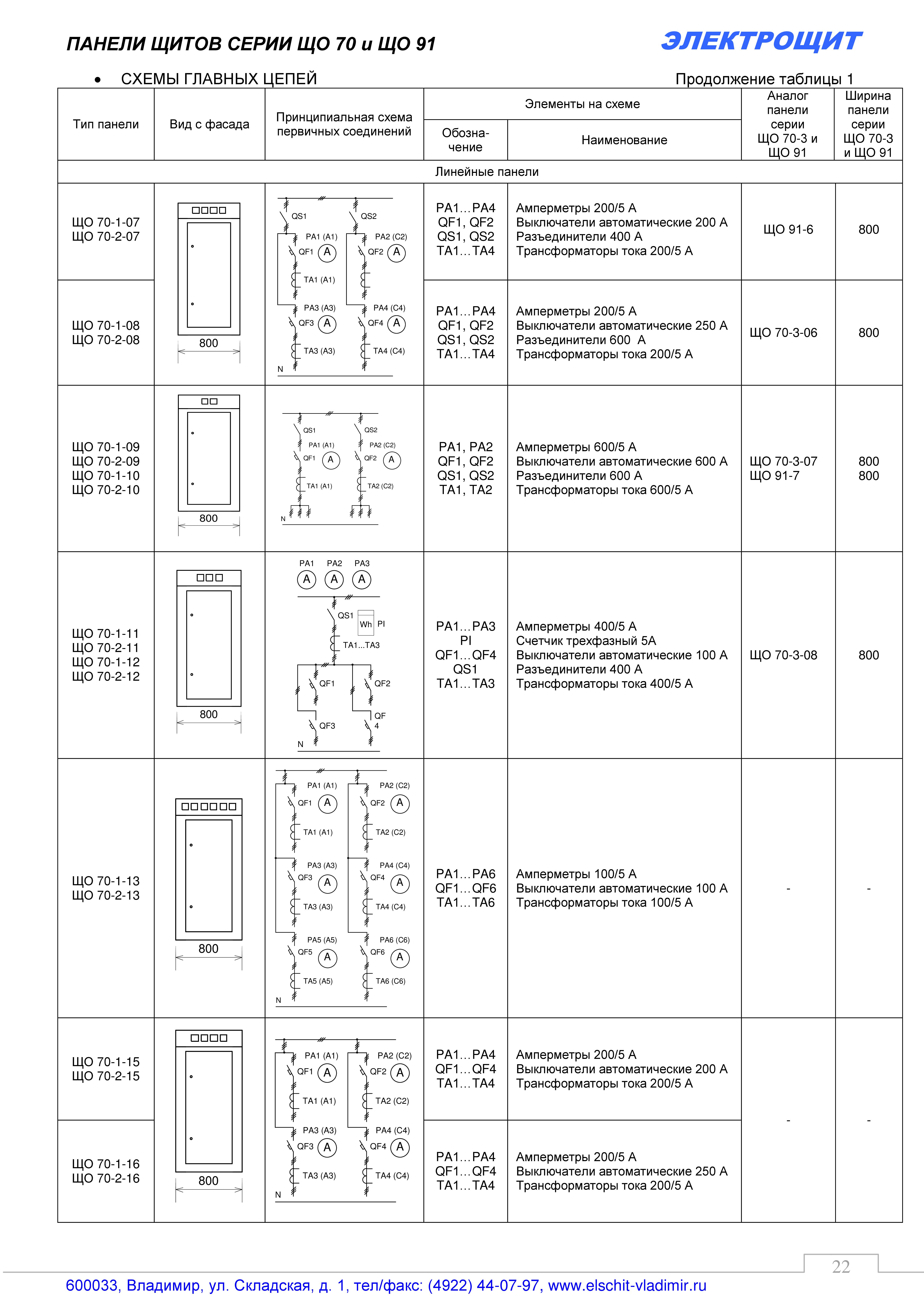 борные шины выполняются шинами из меди или из алюминиевого сплава сечением. Сборные шины располагаются в верхней части щита и крепятся на изоляторах. Сечение шин должно быть указано в опросном листе при заказе распределительного устройства. При заказе распределительного устройства двухрядного исполнения совместно с панелями может поставляться шинный мост. Необходимость его поставки должна быть оговорена в опросном листе с указанием длины. В зависимости от назначения панели щитов ЩО делятся на вводные, линейные, секционные, вводно- линейные, вводно-секционные, панели с аппаратурой АВР, панели диспетчерского управления уличным освещением, панели учета, а также специальные панели (в серии ЩО 70-3). Основным документом для комплектования щитов является опросной лист, в соответствии с которым производится: - компоновка панелей ЩО 70 и ЩО 91; - поставка торцевых панелей, щитков учета, комплекта сборных шин и шинных мостов. Панели комплектуются оборудованием как отечественного, так и импортного производства: автоматическими выключателями серии ВА, «Электрон», ABB, Masterpact NW (Schneider Elektriс). Панели могут быть изготовлены по нетиповыми схемами и комплектацией.