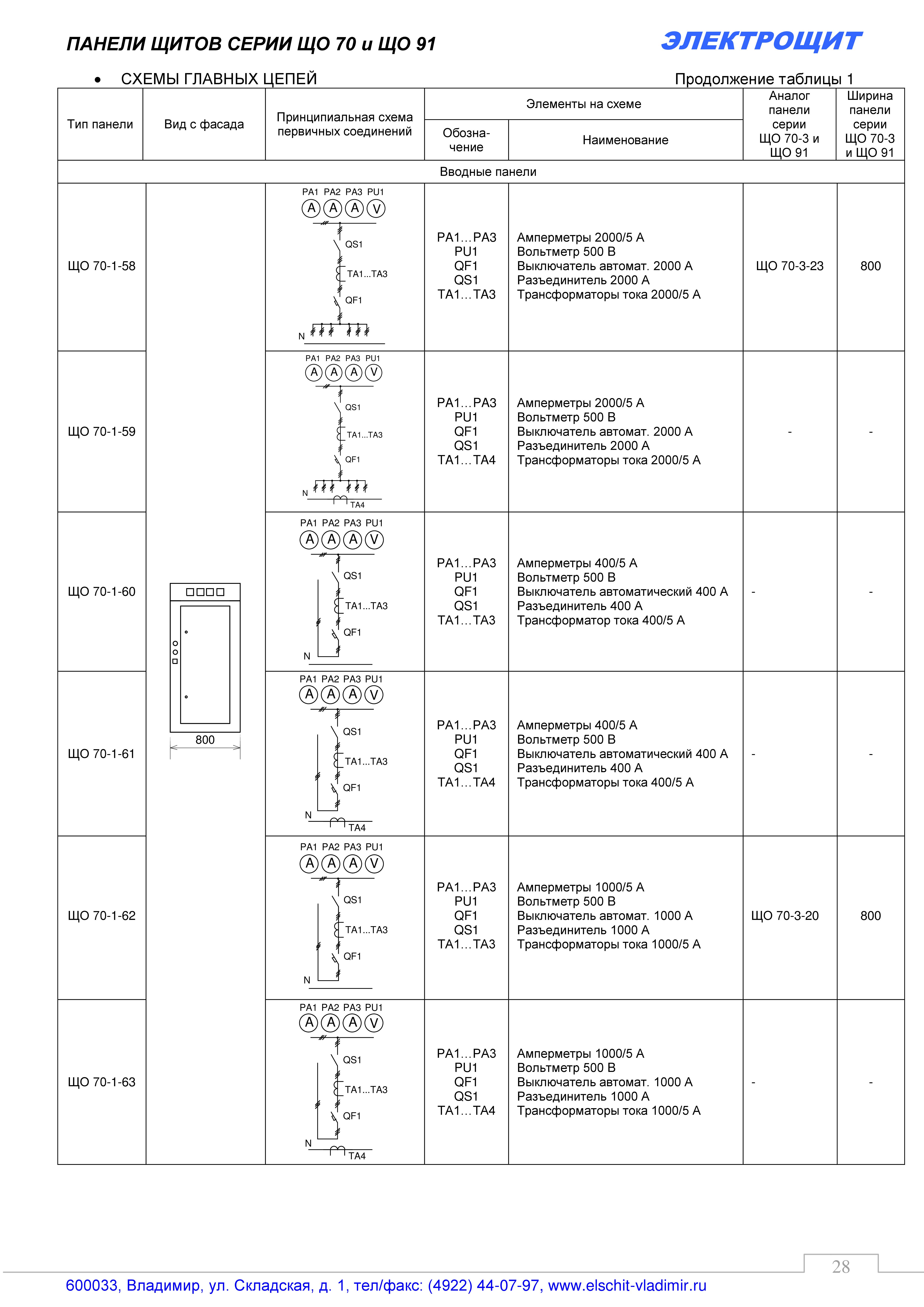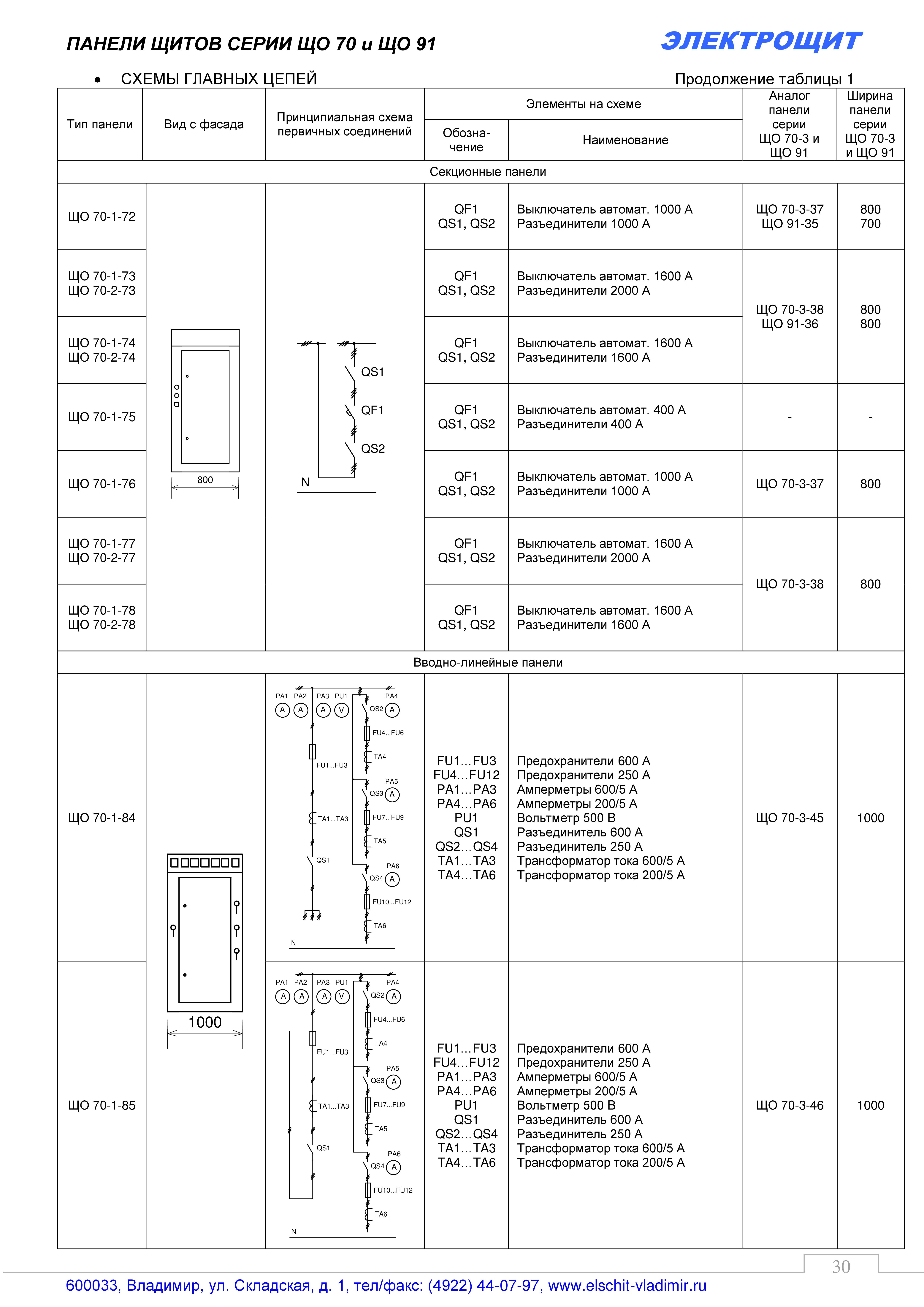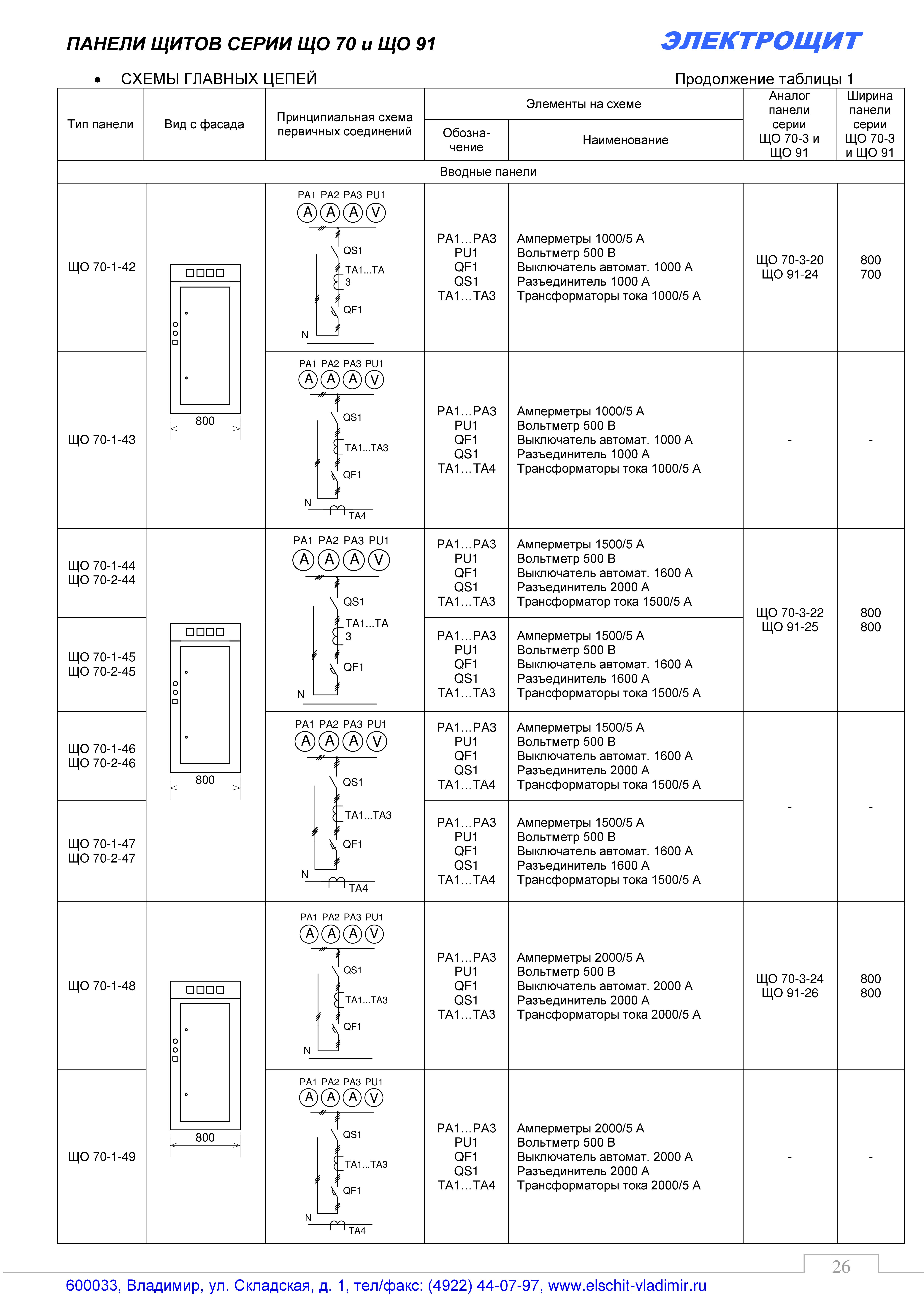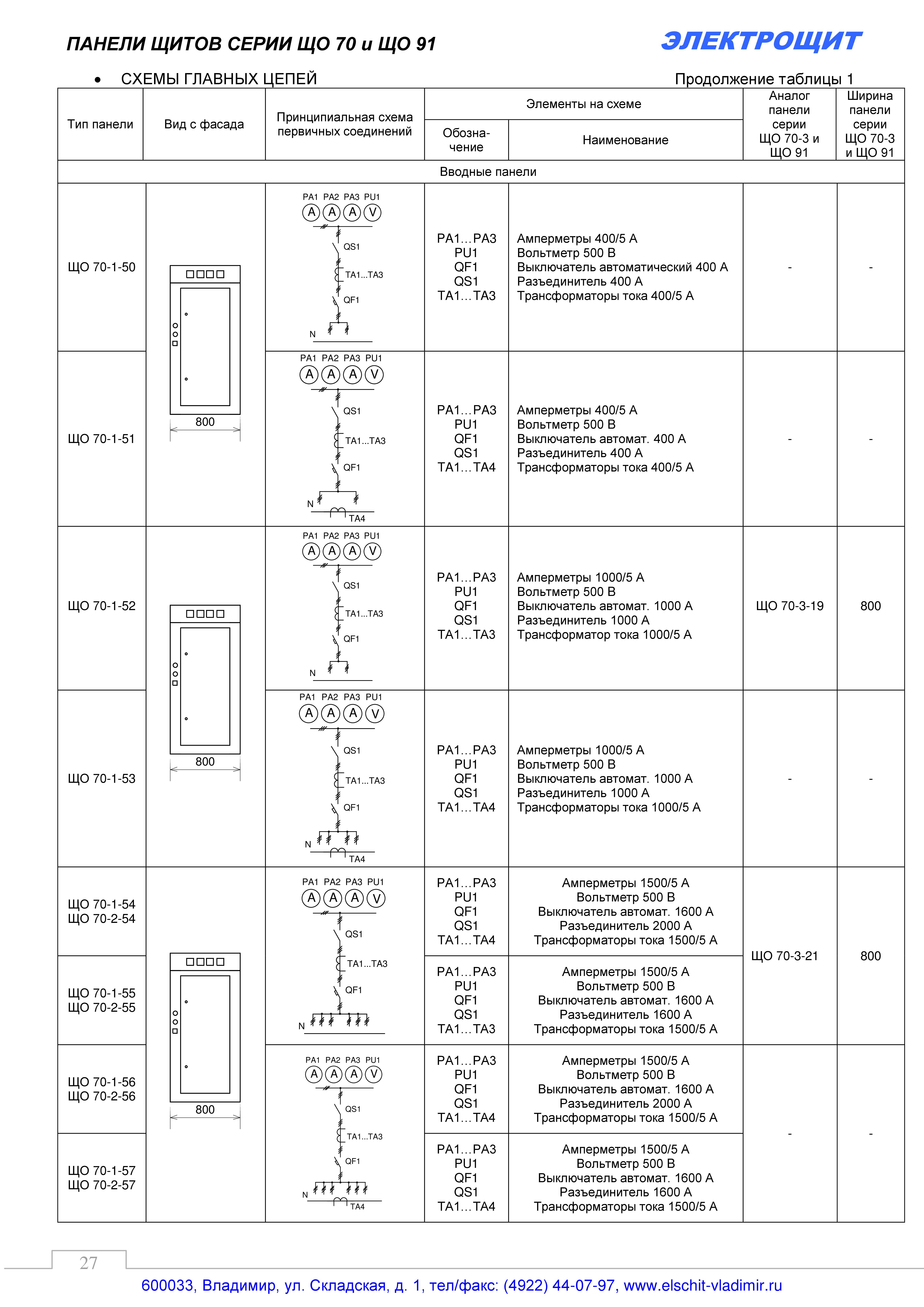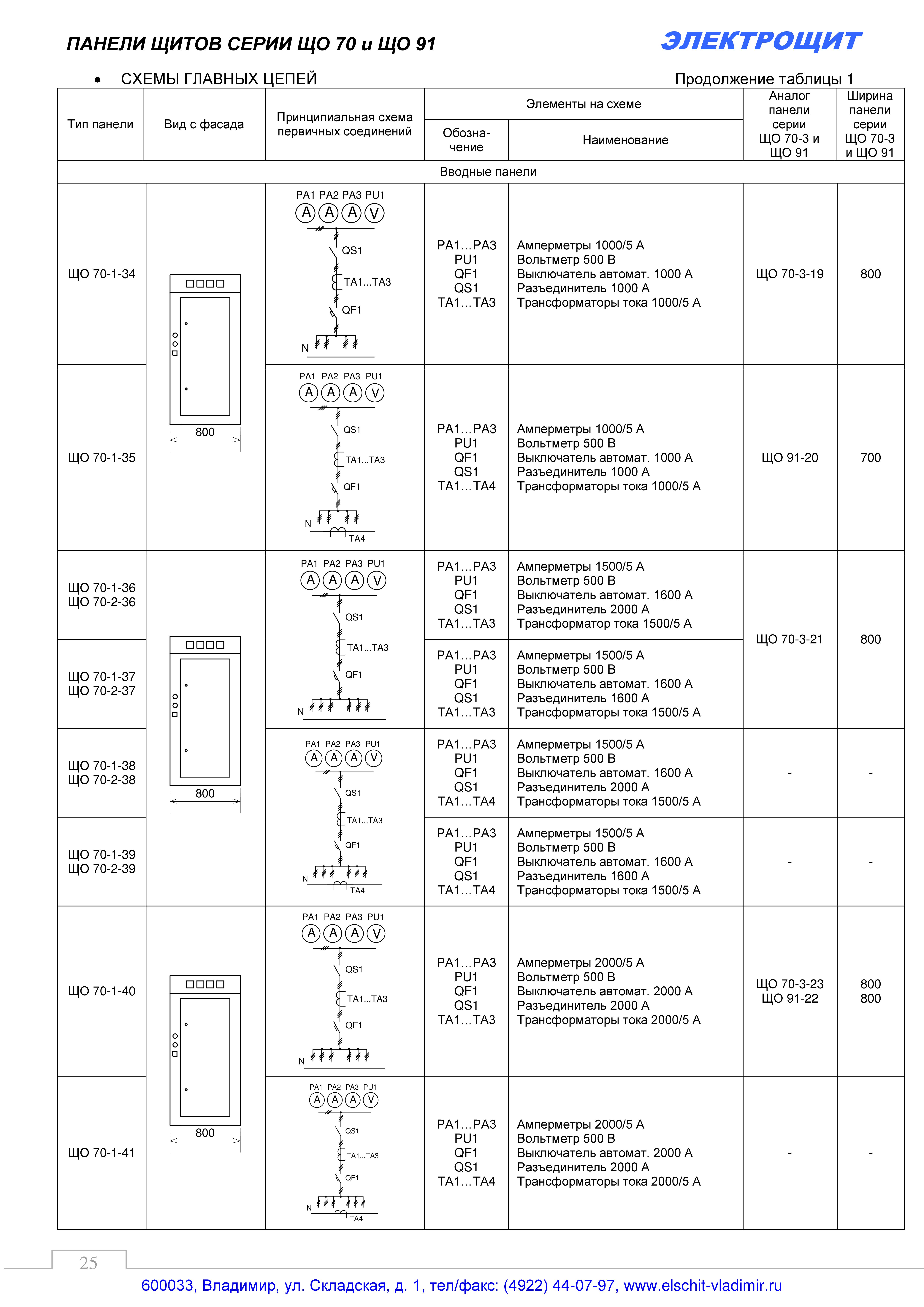 борные шины выполняются шинами из меди или из алюминиевого сплава сечением. Сборные шины располагаются в верхней части щита и крепятся на изоляторах. Сечение шин должно быть указано в опросном листе при заказе распределительного устройства. При заказе распределительного устройства двухрядного исполнения совместно с панелями может поставляться шинный мост. Необходимость его поставки должна быть оговорена в опросном листе с указанием длины. В зависимости от назначения панели щитов ЩО делятся на вводные, линейные, секционные, вводно- линейные, вводно-секционные, панели с аппаратурой АВР, панели диспетчерского управления уличным освещением, панели учета, а также специальные панели (в серии ЩО 70-3). Основным документом для комплектования щитов является опросной лист, в соответствии с которым производится: - компоновка панелей ЩО 70 и ЩО 91; - поставка торцевых панелей, щитков учета, комплекта сборных шин и шинных мостов. Панели комплектуются оборудованием как отечественного, так и импортного производства: автоматическими выключателями серии ВА, «Электрон», ABB, Masterpact NW (Schneider Elektriс). Панели могут быть изготовлены по нетиповыми схемами и комплектацией.