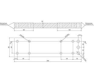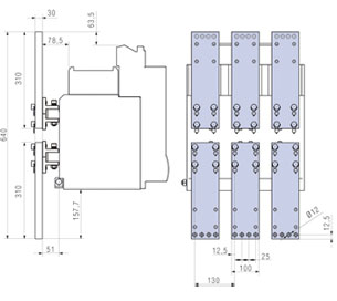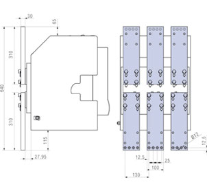 Присоединение плашмя или на ребро | При выдвижном исполнении плоские контакты находятся на каркасе корзины. Комплект контактов (шаг 130 мм) для присоединения («плашмя» или «на ребро») выдвижного исполнения ПРОТОН 40 |