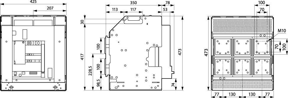 Присоединение плоское | При выдвижном исполнении плоские контакты находятся на каркасе корзины. |
