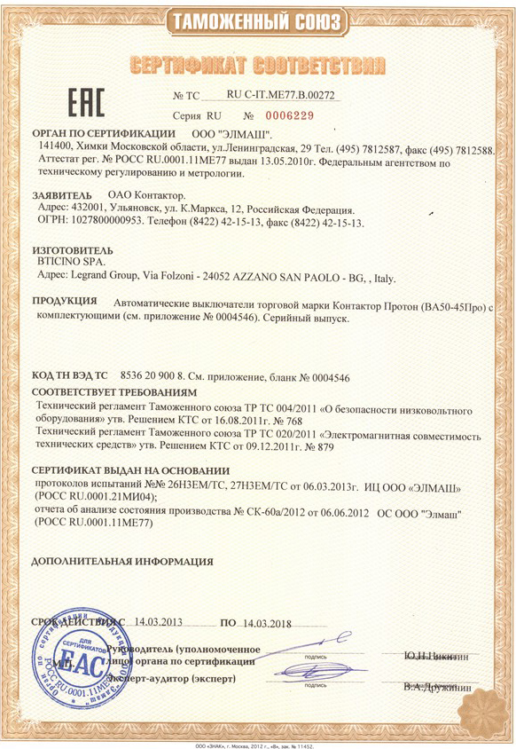 - cоответствие требованиям технического регламента Таможенного союза ТР ТС 004/2011 "О безопасности низковольтного оборудования";