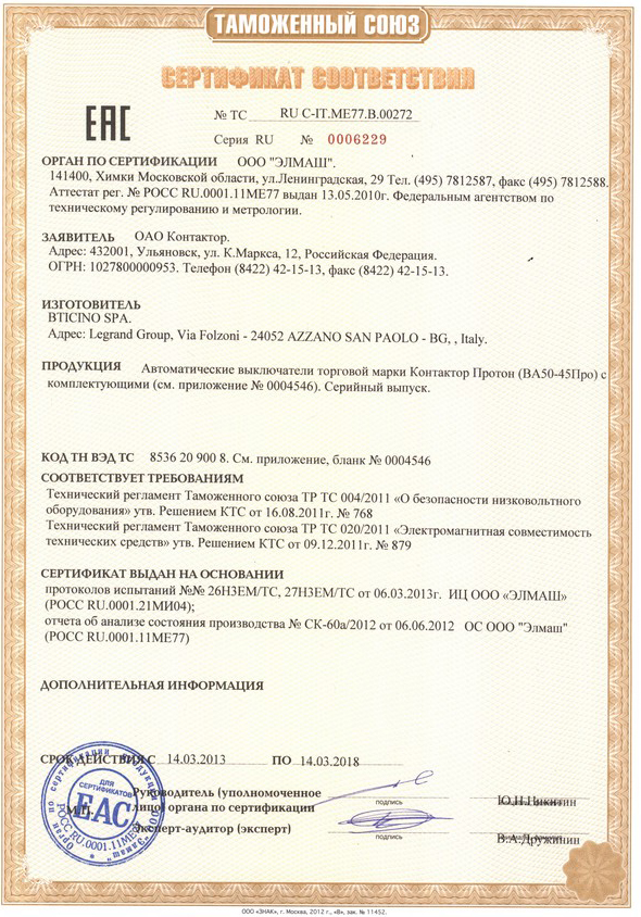 - cоответствие требованиям технического регламента Таможенного союза ТР ТС 004/2011 "О безопасности низковольтного оборудования";