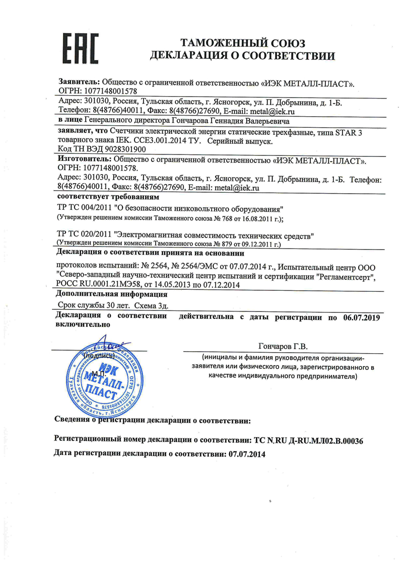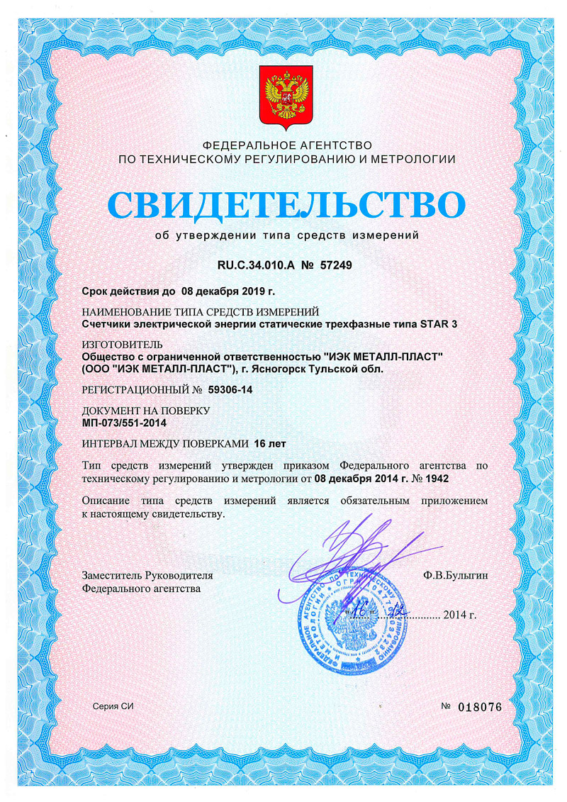 Счётчики электрической энергии STAR внесены в Государственный реестр средств измерении за номерами 59305-14 и 59306-14.