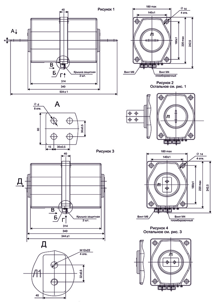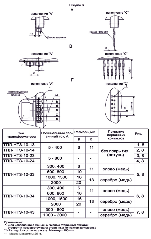 Тип трансформатора | Номинальный первичный ток, А | Размеры, мм | Покрытие первичных контактов | Рисунок | |