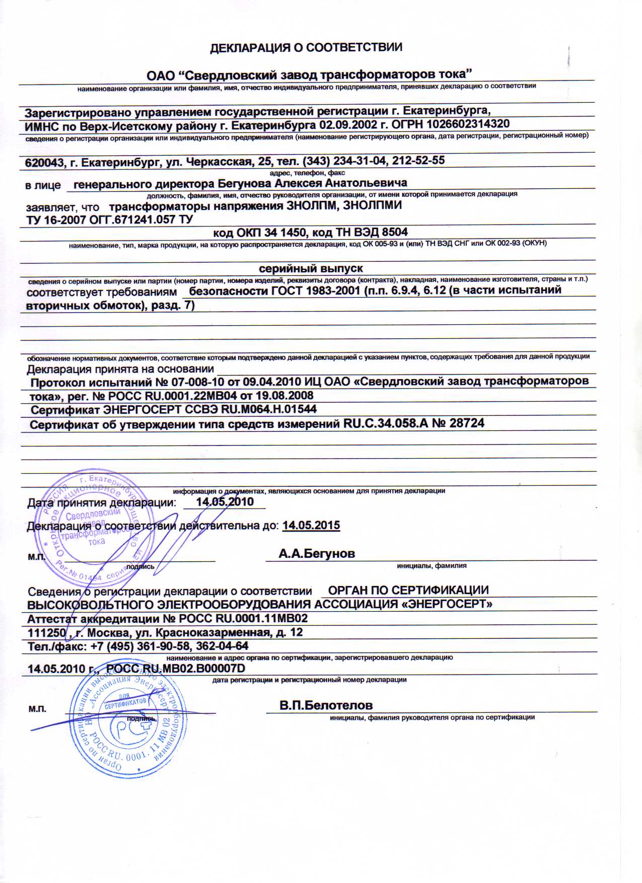 Производитель: ОАО"Свердловский завод трансформаторов тока"