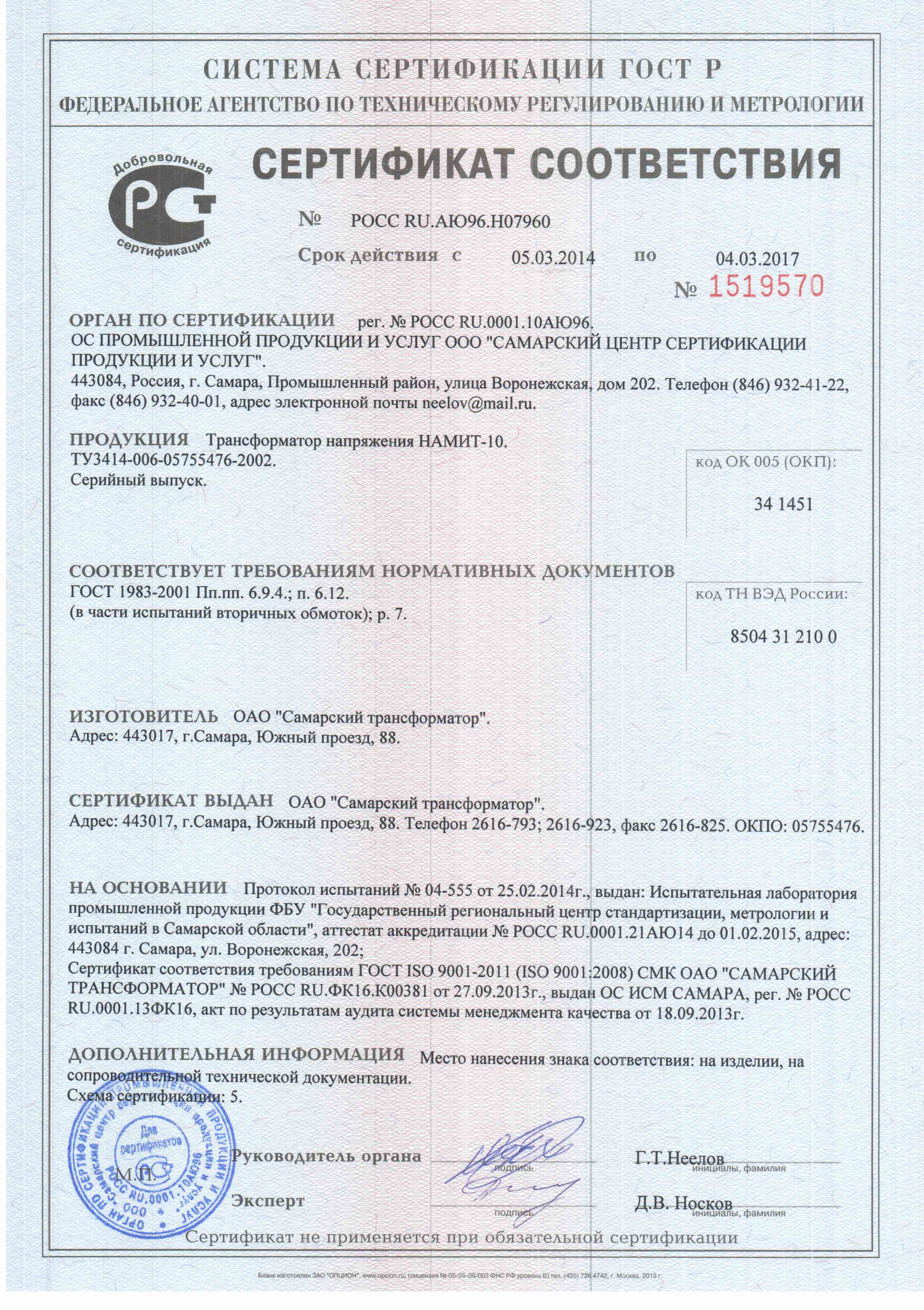 Трансформатор напряжения НАМИТ, изготавливается в климатическом исполнении «УХЛ» и категории размещения «2» по ГОСТ 15150-69.