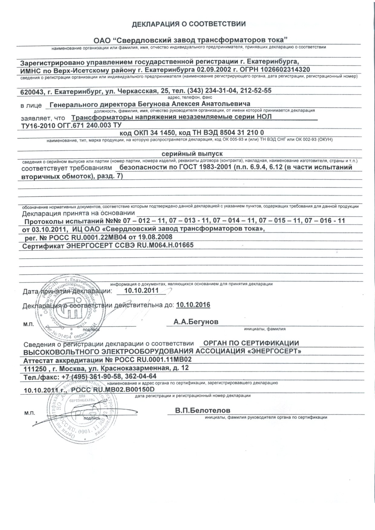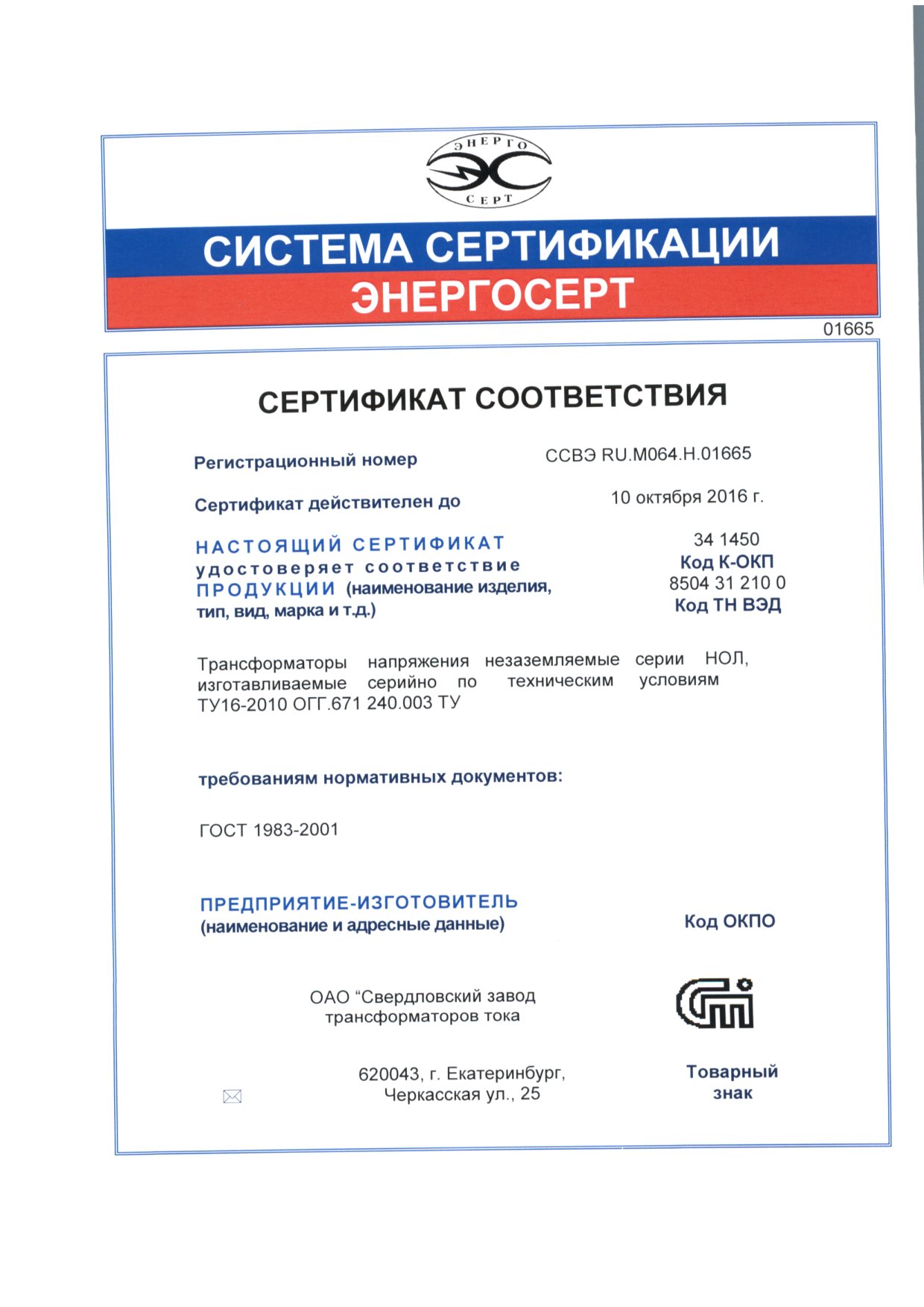 Производитель: ОАО"Свердловский завод трансформаторов тока"