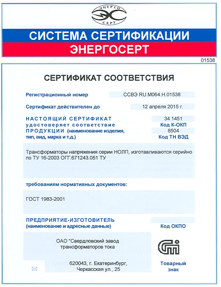 Производитель: ОАО"Свердловский завод трансформаторов тока"