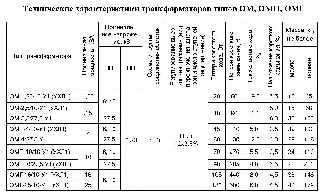 Трансформаторы однофазные типа ОМ, преобразовательные типа ОМП и герметичного исполнения типа ОМГ, класса напряжения до 27,5 кВ с естественным масляным охлаждением, включаемые в сеть переменного тока частотой 50 Гц, предназначены для преобразования электроэнергии в сетях энергосистем, для питания аппаратуры сигнализации автоблокировки железных дорог, а так же питания других однофазных потребителей.