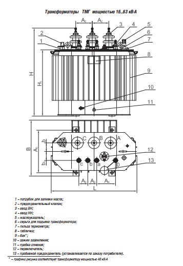 Трехфазные масляные трансформаторы ТМГ предназначены для преобразования электроэнергии в сетях энергосистем и потребителей электроэнергии в условиях наружной или внутренней установки умеренного (от плюс 40 до минус 45 о С ) или холодного (от плюс 40 до минус 60 о С ) климата. Окружающая среда невзрыво- опасная, не содержащая пыли в концентрациях, снижающих параметры изделий в недопустимых пределах. Трансформаторы не предназначены для работы в условиях тряски, вибрации, ударов, в химически активной среде. Высота установки над уровнем моря не более 1000 м. Номинальная частота 50 Гц. Регулирование напряжения осуществляется в диапазоне до ± 5 % на полностью отключенном трансформаторе (ПБВ) переключением ответвлений обмотки ВН ступенями по 2,5 %. Трансформаторы ТМГ герметичного исполнения, без маслорасширителей. Температурные изменения объема масла компенсируются изменением объема гофров бака за счет пластичной их деформации. Для контроля уровня масла трансформаторы снабжаются маслоуказателем поплавкового типа. Для предотвращения возникновения избыточного давления в баке сверх допустимого в трансформаторах мощностью от 16 до 63 кВ. А устанавливается предохранительный клапан. Для контроля внутреннего давления в баке и сигнализации в случае превышения им допустимой величины в трансформаторах мощностью 100 кВ. А и выше, размещаемых в помещении, предусматривается по заказу потребителя установка электроконтактного мановакуумметра. Для измерения температуры верхних слоев масла на крышке трансформаторов предусмотрена гильза для установки жидкостного стеклянного термометра.