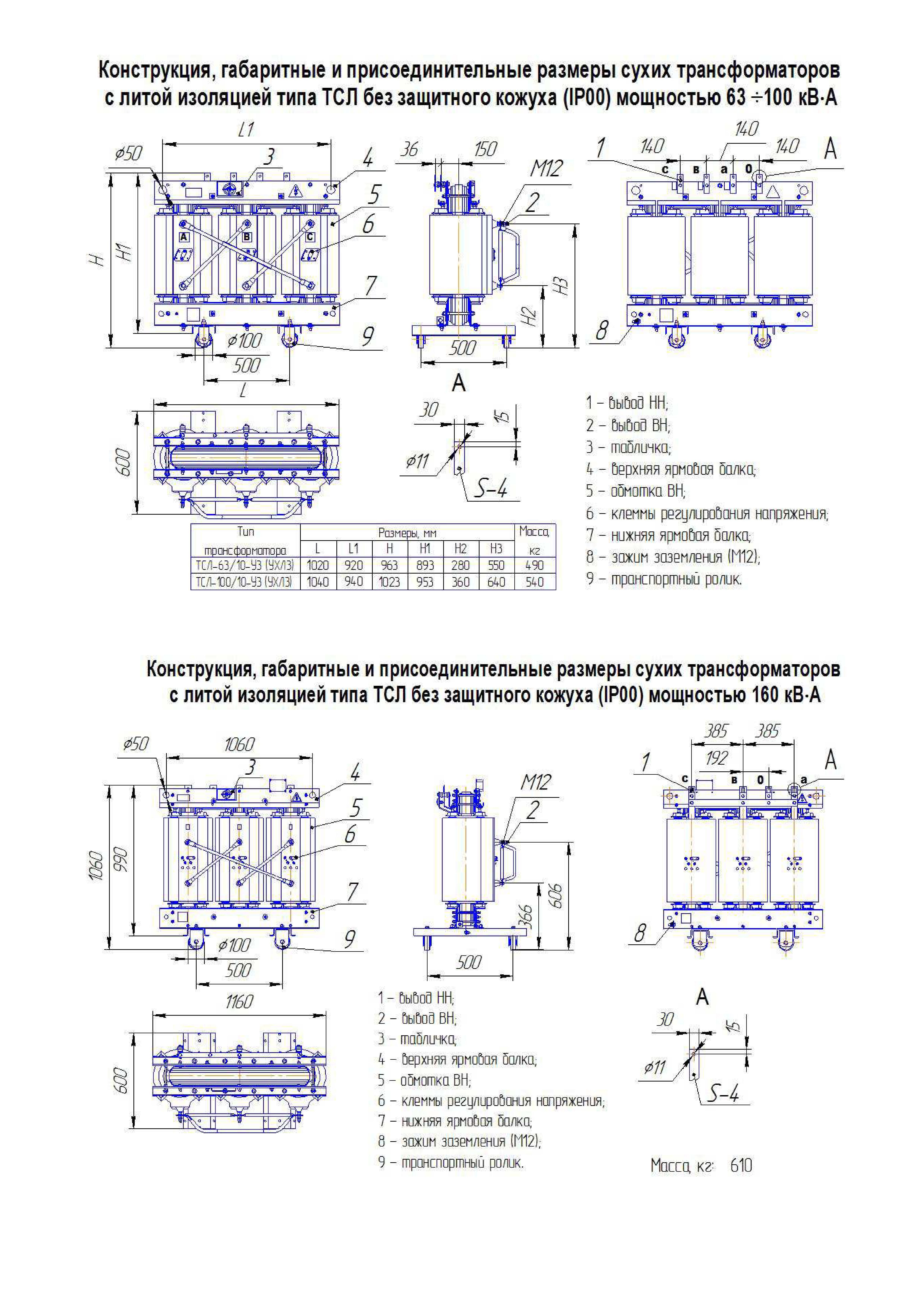 Технические характеристики сухих трансформаторов с литой изоляцией типа ТСЛ (ТСЗЛ) 10-160/10