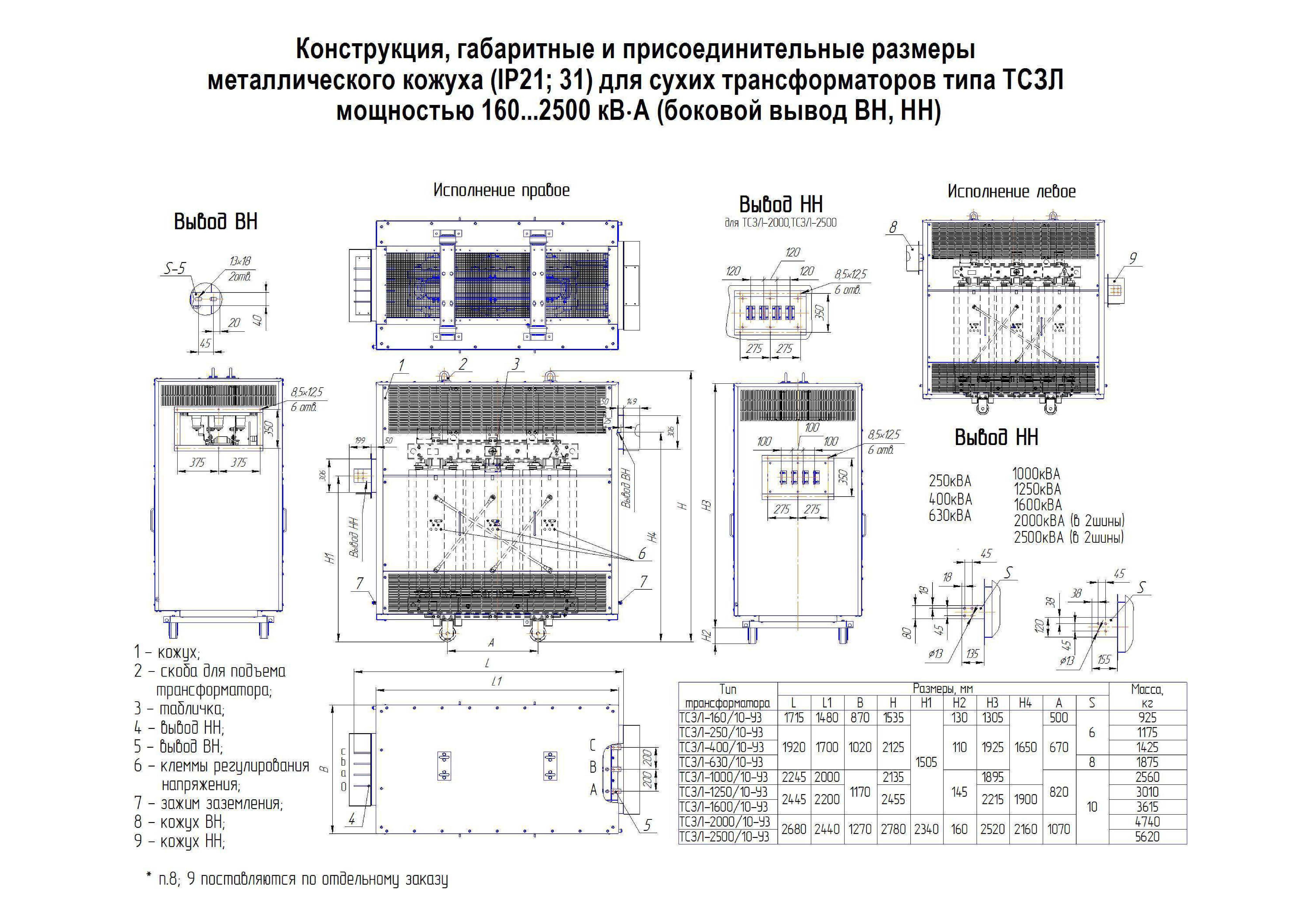 Технические характеристики сухих трансформаторов с литой изоляцией типа ТСЛ (ТСЗЛ) - 250¸2500/10