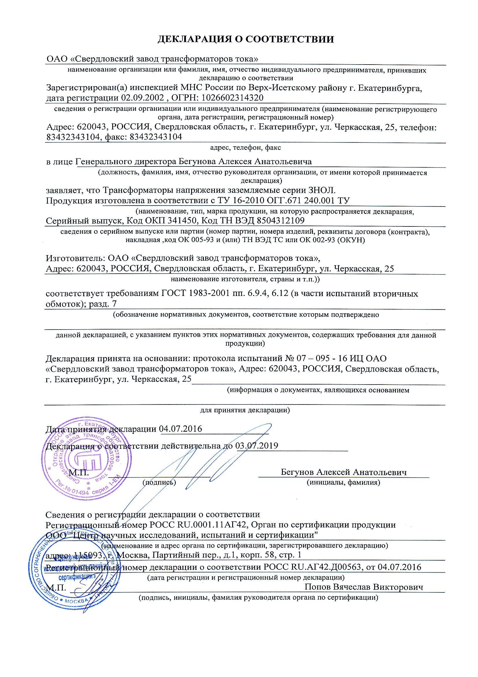 Производитель: ОАО"Свердловский завод трансформаторов тока"