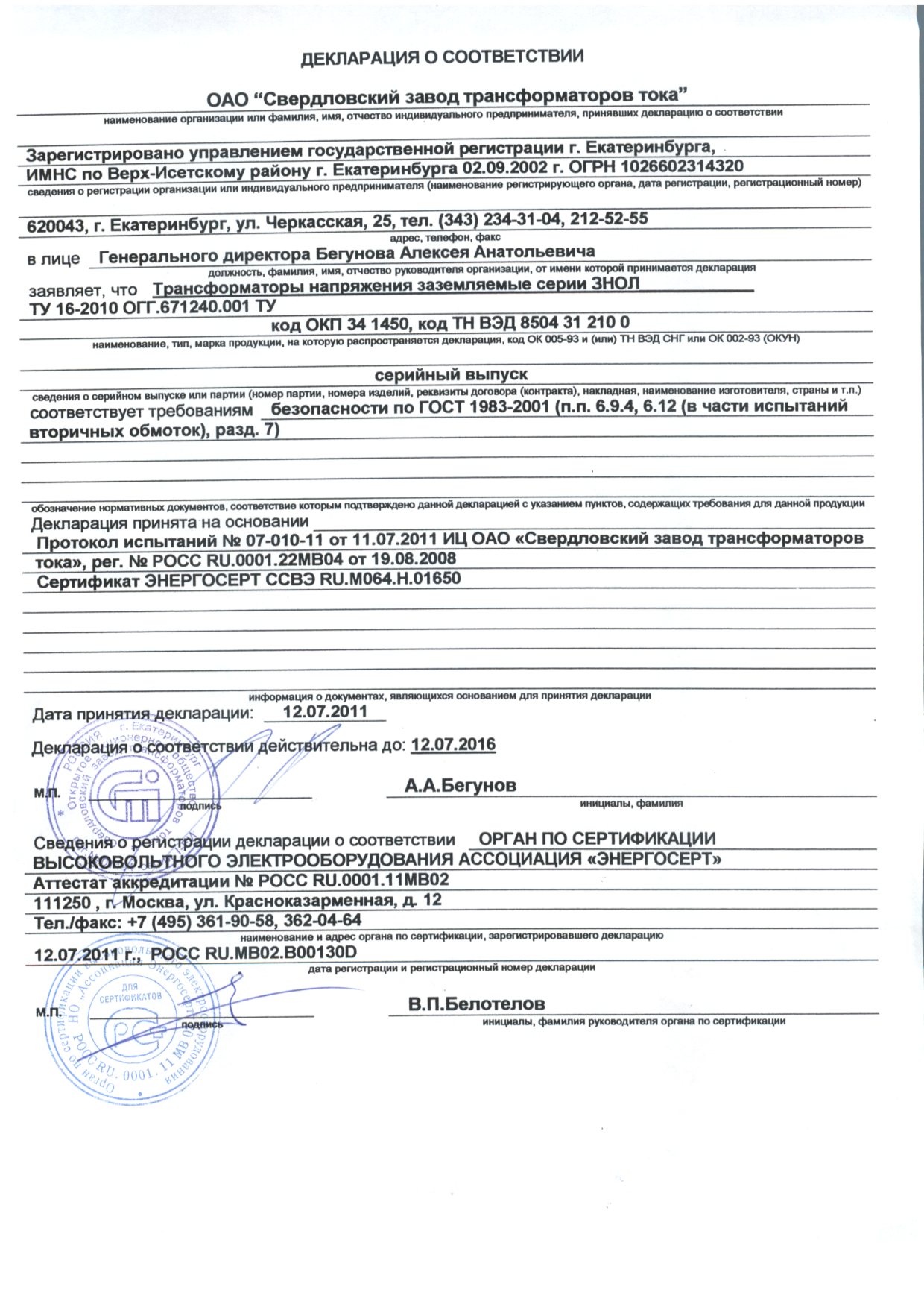 Производитель: ОАО"Свердловский завод трансформаторов тока"