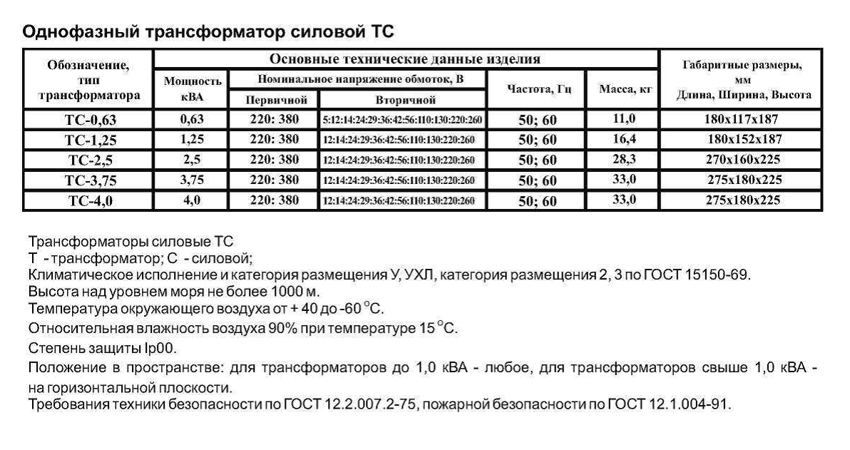 ТС-0,63 | 0,63 | 220; 380 | 5:12:14:24:29:36:42:56:110:130:220:260 | 0,52 | 180х117х187 |